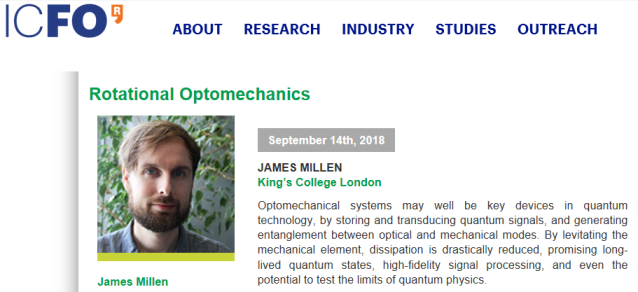 James was extremely pleased to finally make it to ICFO in Barcelona, to see the amazing nanophotonics experiments of Prof. Romain Quidant, to catch up with old colleagues and make new ones, and to give a talk on rotational optomechanics. Gràcies!