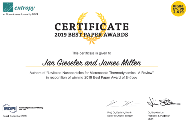 The article “Levitated Nanoparticles for Microscopic Thermodynamics – A Review” written by Jan Gieseler and James has won the Best Paper of 2019 award in the journal Entropy. I hope it’s a useful resource for the community.